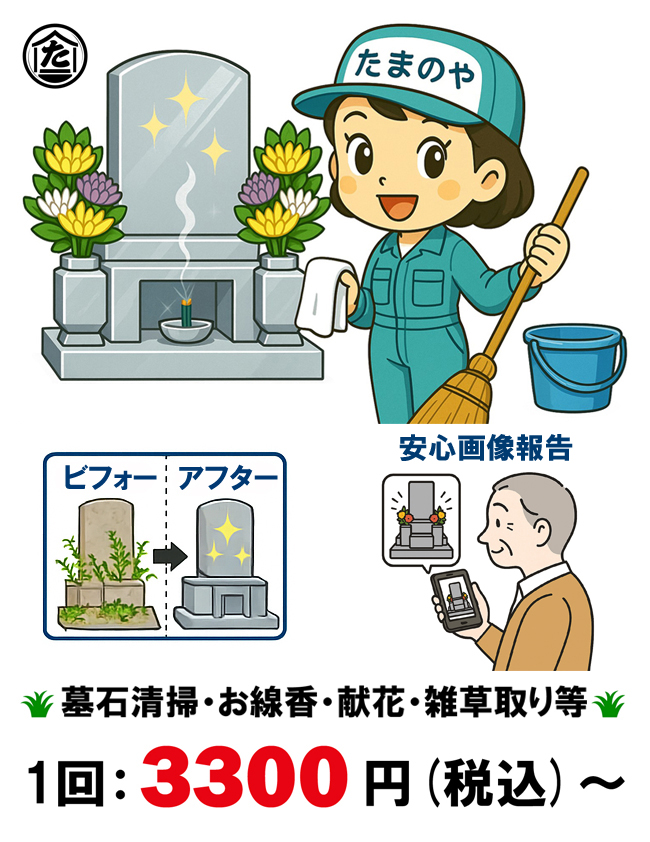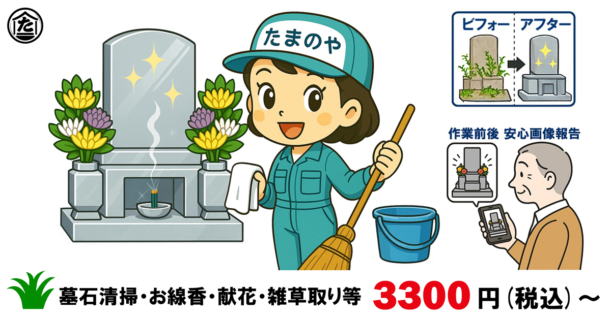 🧹 たまのやでは、単なる清掃代行ではなく、ご先祖さまへの敬意と心を大切にしたお墓参りを代行いたします。
