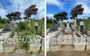 「たまのや」では、多磨霊園での作業完了後に、作業前後の写真(約15〜30枚)と簡単なご報告をセットでお届けしております。今回はその一部を抜粋し、「お墓参り コース」で実際に撮影したビフォー・アフターの様子をご紹介いたします。