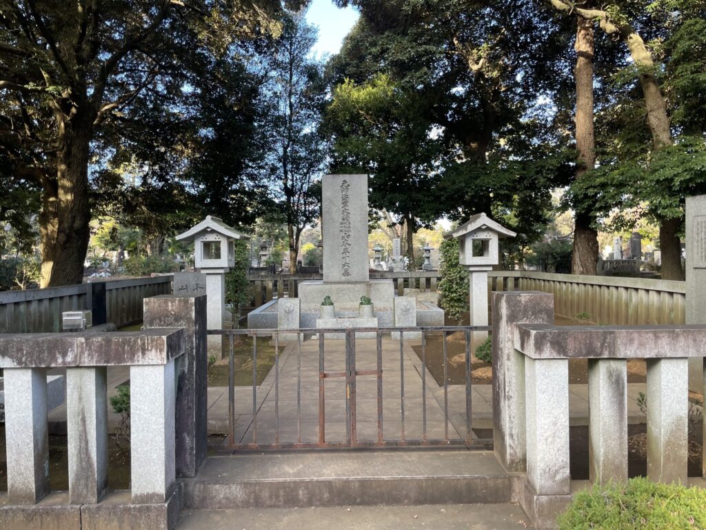 多磨霊園の静かな並木道を進むと、ひときわ風格ある墓碑が現れます。