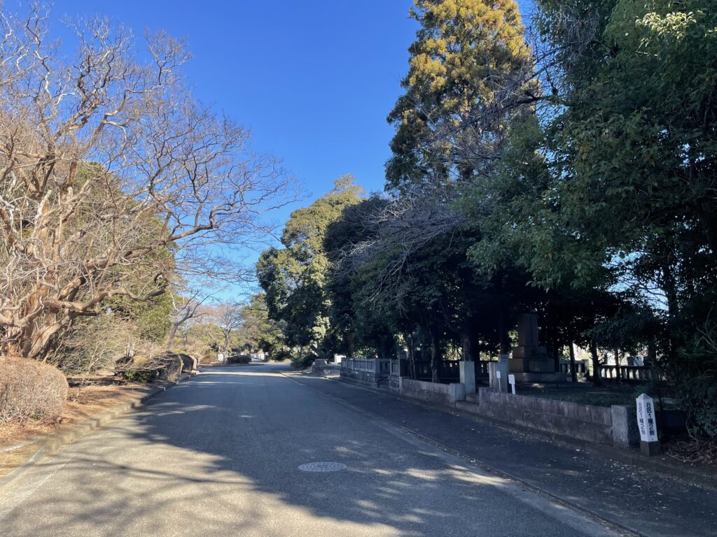 参道沿いから墓域を望むと、石柵の内側に整然と墓石が並び、明治の軍人らしい節度と静謐さが感じられます。