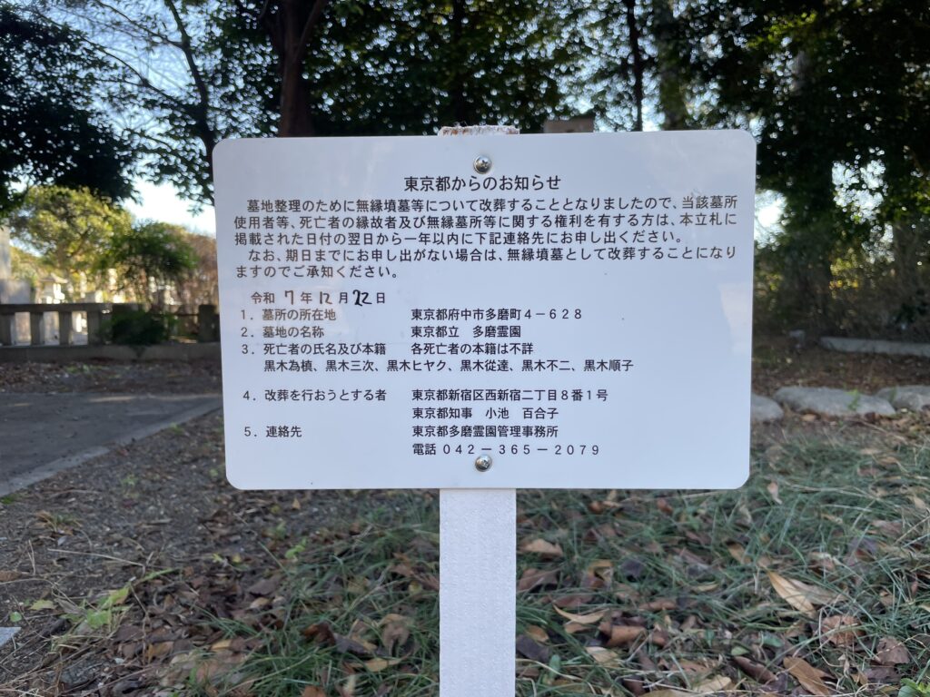 このように、落ち着いた佇まいを保つ墓所ですが、現在は墓所管理者と連絡が取れていない状況のようで、管理事務所による案内看板が設置されていました。