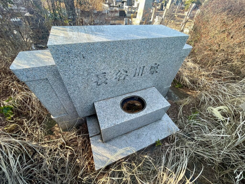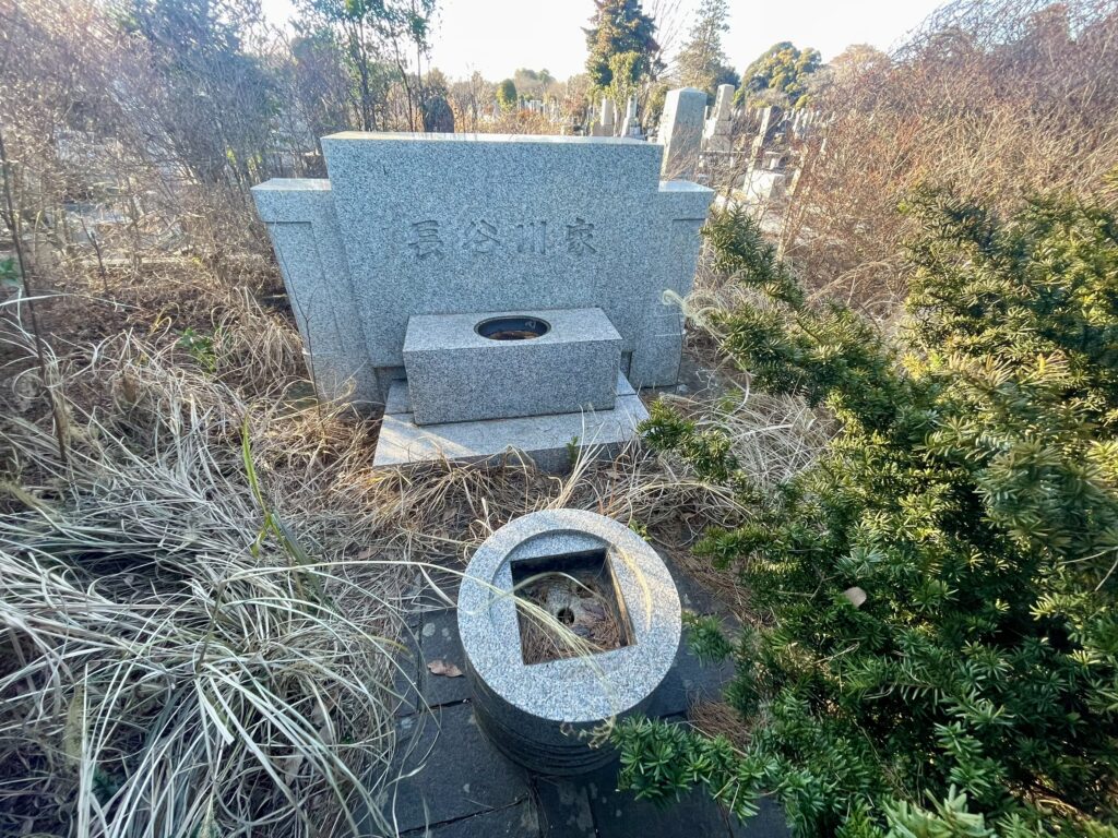 墓石正面には「長谷川家」と刻まれており、その上部には十字架の彫刻が見られます。長谷川家がキリスト教徒であることがうかがえるデザインで、他の墓所とはまた違った趣があります。町子さん個人の名は刻まれていませんが、代々の長谷川家のお墓として静かにたたずんでいます。