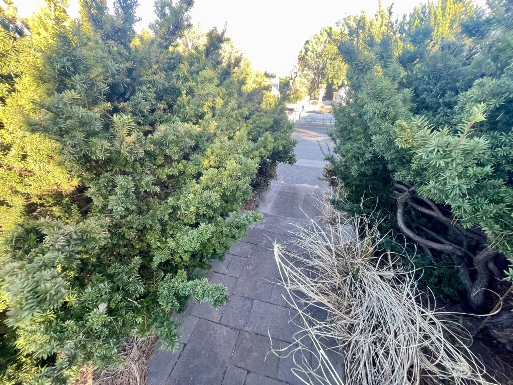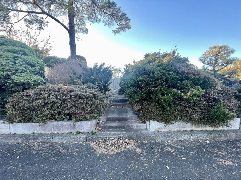 かつては多くのファンが訪れていたとされる墓所ですが、植栽がかなり生い茂り、少し見つけづらい印象です。インターネット上にはさまざまな時期の墓所の写真も見られ、時代ごとの管理状況をうかがい知ることができますが、現在はあまり植木のお手入れがされていないようで、まるで静かな森の中のような雰囲気です。