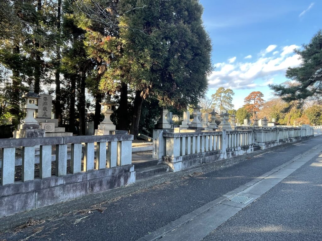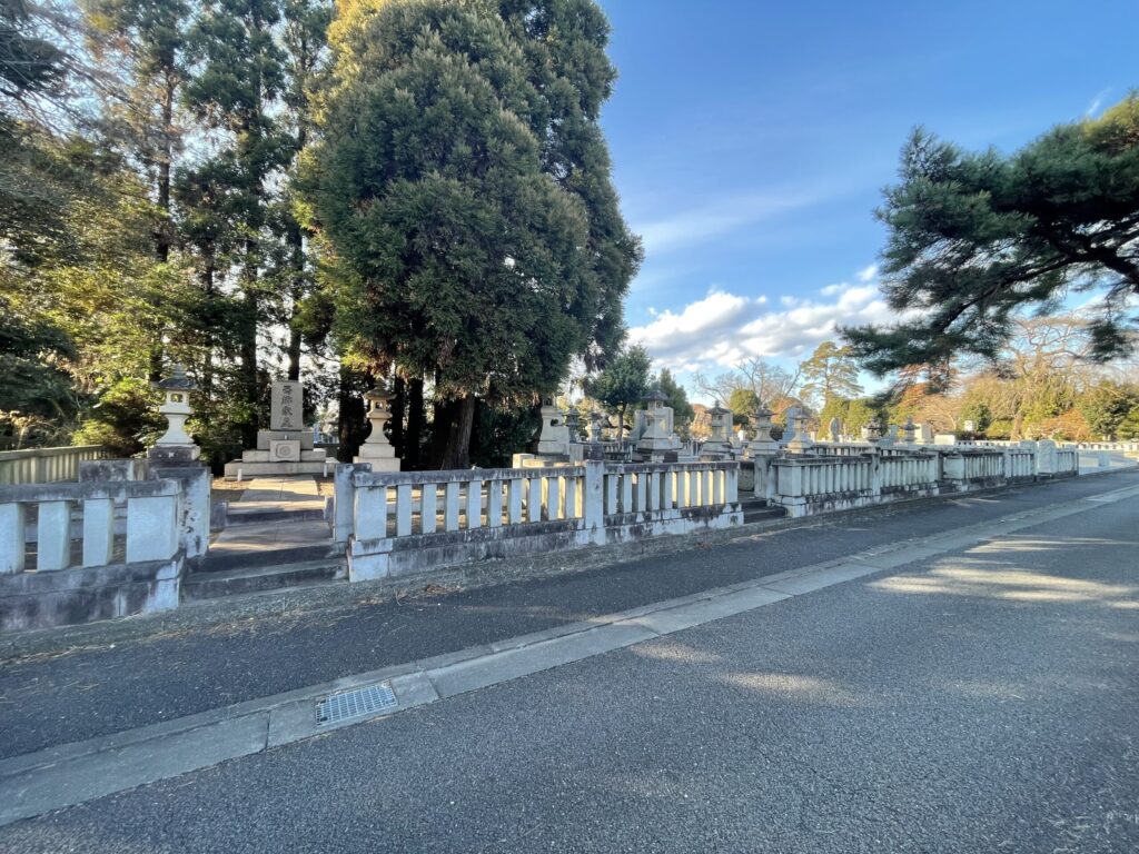 入り口から続く参道は、両脇に松や常緑樹が立ち並び、まるで時代を超えてきたかのような静けさが漂っています。墓所を囲う白い石柵は長く連なり、その奥に複数の墓石と灯籠が整然と並ぶ姿は壮観です。
