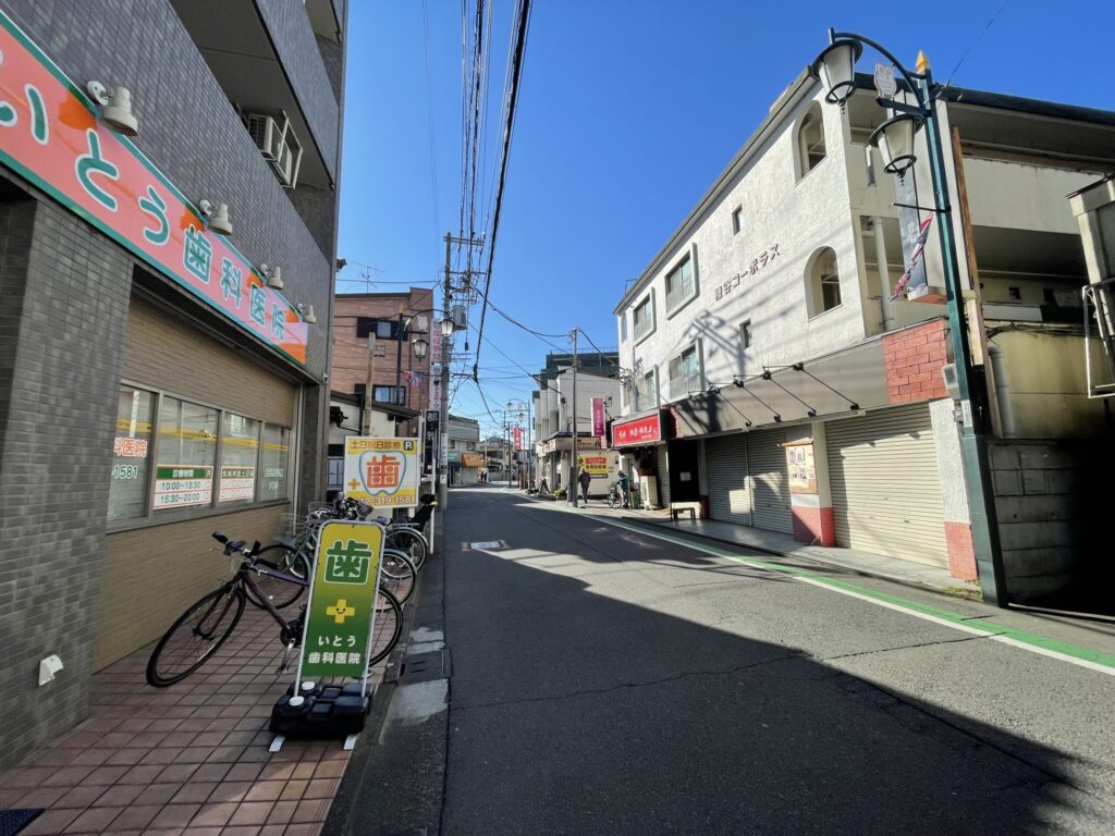 エスカレーターを下りたら右です。東郷寺通りを道なりにまっすぐ進みます。