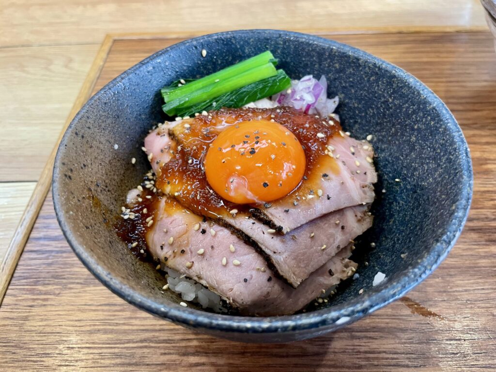 ご飯の上には、しっとりと火入れされた豚肉が贅沢に重ねられ、中央には艶やかな卵黄。